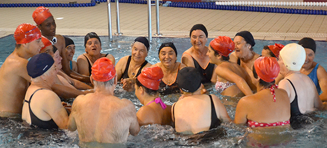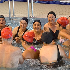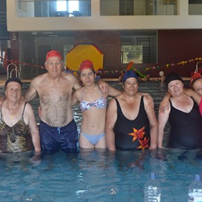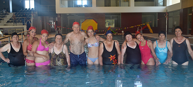 It took about 8Km to arrive and it was a hot day. We get in and we prepared ourselves to the water exercises. There was a teacher and the group of 10 senior people. The exercises where based on games and not swimming lessons. The groups were mixed between young people and old generations.