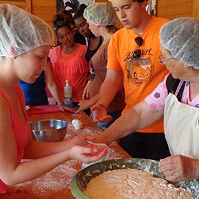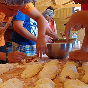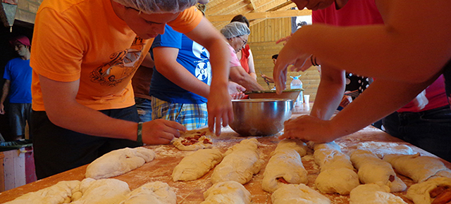 Enquanto esperavam que o óleo aquecesse bastante, estes jovens aproveitaram para terminar a confeção dos pães. Pegaram na massa, que já saía do alguidar, e esticaram-na, acrescentaram o chouriço e enrolaram-na. Visto que um dos principais objetivos do IYSC é o respeito pelas outras culturas, pelas outras religiões, pelas outras ideologias, pelo nosso próximo, fizemos alguns pães sem chouriço para quem não pode comer carne de porco. Finalmente o pão estava pronto para ser levado ao forno.