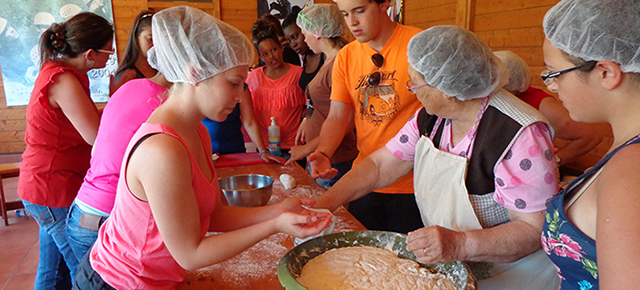 18 de julho, quarta-feira, às 10:00 horas, o grupo da Gastronomia formado por malteses franceses e Portugueses, juntamente com os idosos do Centro Social do Olho Marinho, 15 pessoas, liderado pelas animadoras Patricia e Cesaltina iniciaram a preparação do programa do dia. Após a instalação de todos os equipamentos e das apresentações de cada um dos participantes, os ingredientes foram espalhados pela longa mesa: o fermento em pó, manteiga, leite, ovos, água, canela, flor e açúcar e Chouriço. A mestre Maria de Lurdes começou a mostrar ao grupo de Gastronomia como fazer e cozer o pão. O famoso Pão com Chouriço, uma tradição muito antiga na região, principalmente utilizado pelos agricultores nas suas jornadas de trabalho mais prolongadas.