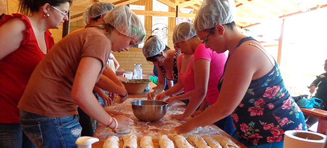 Senior Maria de Lurdes started to show the Gastronomy group how to bake the bread. The famous Pão com Chouriço a very old tradition in the region mainly used by the farmers on their long work journeys. The three nations started the baking with their hands adding forms and shapes for example there was: Heart form and moon etc. The group started the Pão com Chouriço adventure day mixing everything and preparing the bread dough together with yeast that afterwards should remain at least one hour leavening.